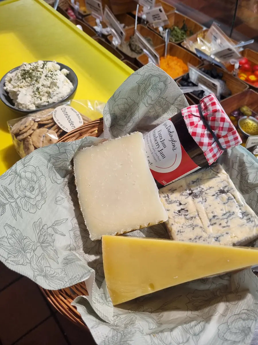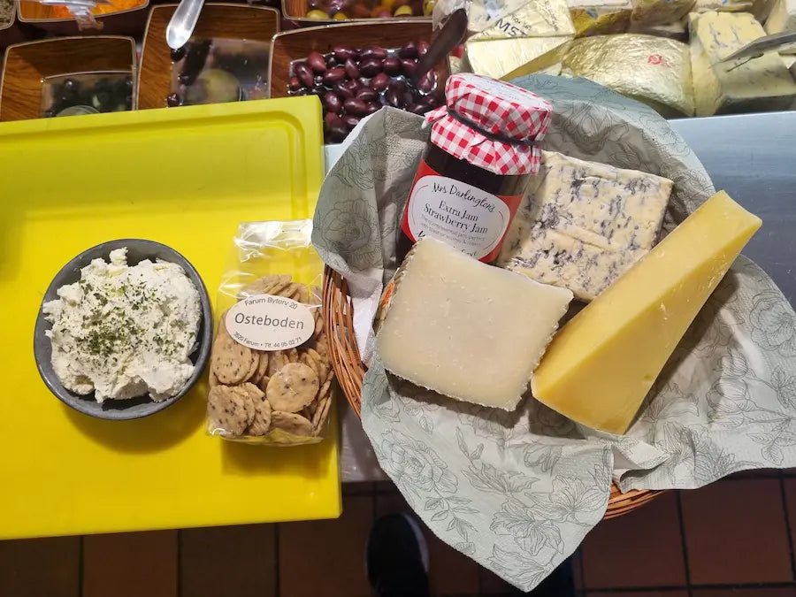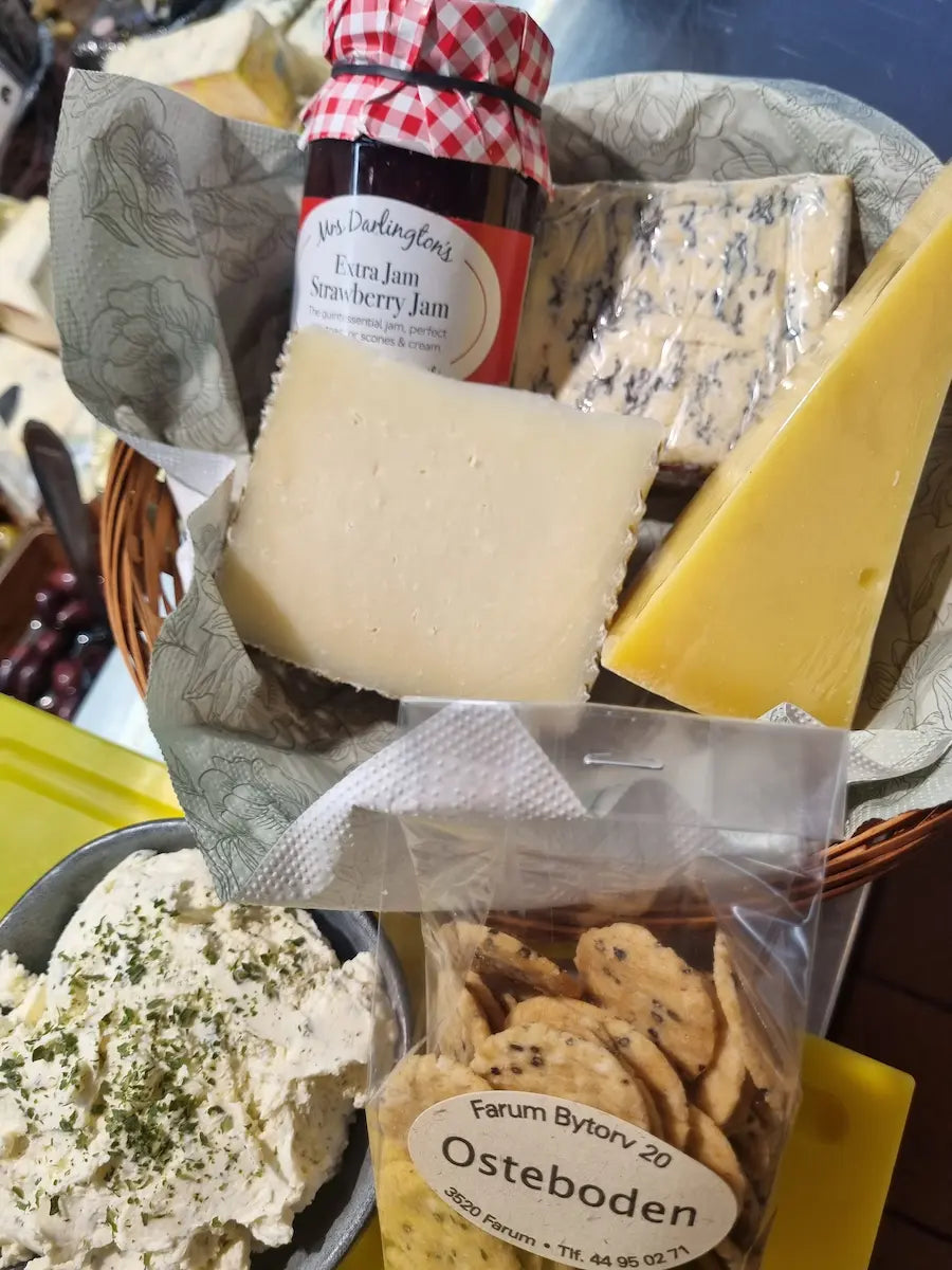 200 g. af ostemandens hjemmelavede hvidløgsost, 200 g. Vesterhavsost, 200g. Saint Agur, 200g. Brie de Meaux, 200g. Manchego, og som tilbehør en lækker marmelade samt friske rischips.
