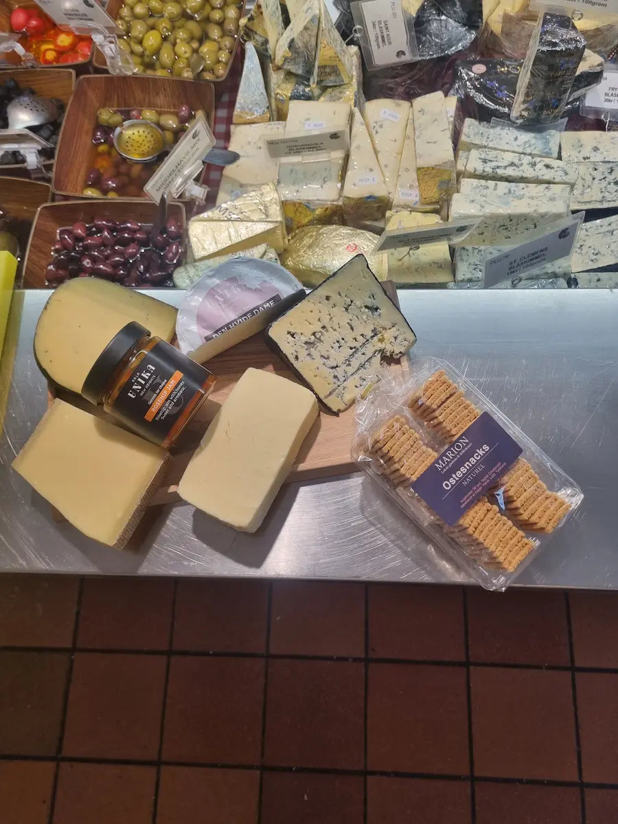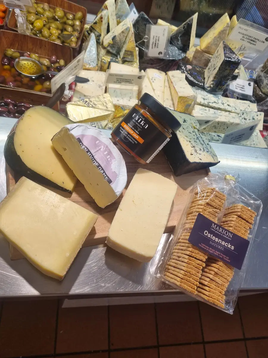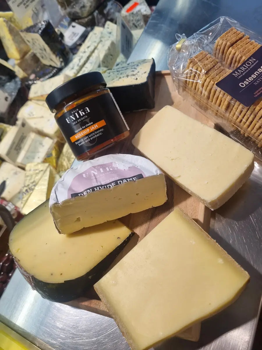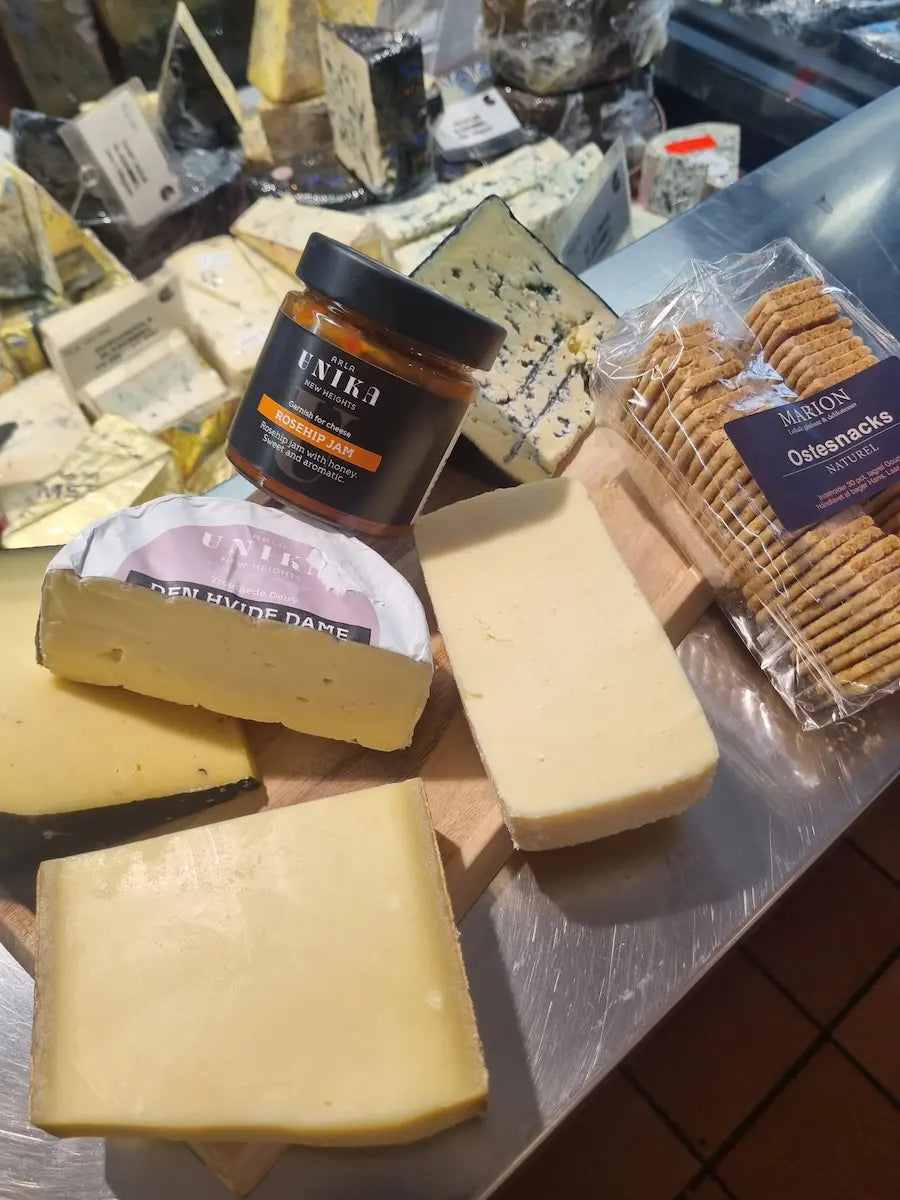 200g. Roquefort, 200g. ARLA Unikas Gammel Knas, 200g. Gruyere, 200g. Gouda med trøffel, 200g. ARLA Unika 'Den hvide Dame' , samt en marmelade og Ostesnack deluxe som tilbehør.